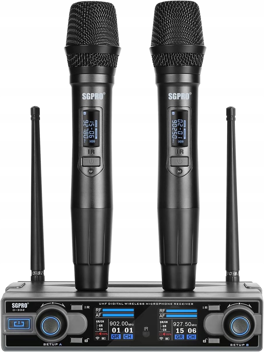 - S VHODNÝMI FUNKCEMI: Dvojitý bezdrátový ruční mikrofon SGPRO D-332 je vybaven indikátorem stavu nabití baterie, regulací hlasitosti, funkcí ztlumení, TFT displejem a menu a pokročilým skenováním frekvencí a párováním.