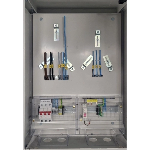 Elektroměrový rozvaděč pro fotovoltaiku pro jeden dvoutarifní třífázový elektroměr pro měření do 63A (popř. 80A – musí být uvedeno v objednávce). Ekonomické provedení. Hlavní jistič není standardně součástí rozvaděče, obsahuje pouze jistič HDO a vypínač instalace 63/3. Parametry: distribuční síť: E.ON uspořádání rozvaděče: samostatný uspořádání měřící soustavy: dvoutarifní třífázový počet elektroměrů: 1 druh rozvaděče: elektroměrový pro přímé měření tělo rozvaděče: X počet jistících sad: 0 pojistkový spodek: bez pojistkového spodku materiálové provedení: termoset konstrukční provedení: vestavná způsob připojení přívodu: P – konstrukční svorka průřez vodičů přívodu: 16 mm2 způsob připojení vývodu: P – konstrukční svorka průřez vodičů vývodu: 16 mm2 uzavíraní dveří: jednobodové se čtyřhranem 6×6 mm jmenovitý proud: 63 A jmenovité napětí: 230/400 V stupeň krytí: IP44 jmenovitý kmitočet: 50 Hz výška: 600 mm šířka: 470 mm hloubka: 220 mm