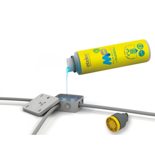 Gel dvousložkový MPone 600 (0,6 litru -1 láhev ), bez expirace, izolační zalévací gel, rozebíratelné spojení, barva: transparentní modrá, doba zpracovatelnosti: cca 15 sekund, doba tuhnutí: cca 8 minut při teplotě 23°C.Dvousložkový zalévací gel – ETELEC MPone. Pro výplň a izolaci elektrických spojů. Rychle a jednoduše chrání spoj před nepříznivými přírodními vlivy jako je vlhkost, prach a další nečistoty. Složky gelu „A“ i složka gelu „B“ jsou obsaženy v jedné láhvy. Po smíchání obou složek gelu je výsledná hmota průhledná s nízkou viskozitou a po vytuhnutí zůstává po celou dobu životnosti spoje rosolovitá. Při samotném vylévání krabičky nebo jiného média krásně zatéká do všech zákoutí. Spoj lze po vytuhnutí jednoduše rozebrat. Gel je šetrný k životnímu prostředí. Navíc nemá žadnou expiraci – můžete jej uchovávat/skladovat mít jej k použití kdykoliv bude potřeba. Dielektrická pevnost 25,5 kV/mm.