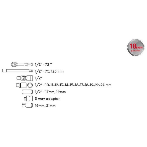 Kvalitní gola sada je vhodná díky kvalitě použitých materiálů a zpracování v profesionální autodílně nebo servisu. 10 let záruka. Všechny části jsou vyrobeny z vysoce kvalitní chrom-vanadiové oceli. Niklová povrchová úprava. Hroty bitů jsou ze slitiny oceli S2. Ráčny mají jemné dělení 72 zubů, tělo ráčny z CrV oceli, zubový mechanismus z S2 oceli, ergonomicky tvarovanou rukojeť se zdravotně nezávadnou gumou. Nový design plastového kufru z primárního materiálu s kovovými uzávěry a panty víka. Obsah sady: Ráčna: 1/2″ / 72 zubů Prodloužení: 250 mm Trhák: 1/2″ Hlavice nástrčné: 10 – 11 – 12 – 13 – 14 – 15 – 16 – 17 – 18 – 19 – 22 – 24 mm Hlavice nástrčné prodloužené: 17 – 19 mm Hlavice na svíčku: 16 – 21 mm Příslušenství: adapter, kloub
