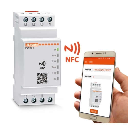 Ochranné relé napětí a frekvence s NFC technologií Nové ochranné relé s NFC technologií pro monitorování napětí a frekvence v třífázových sítích se středním pracovním vodičem N i bez. Vlastnosti Vlastní napájení z chráněného obvodu Jmenovité fázové napětí: – 380…575VAC Jmenovitá frekvence: 50/60Hz PMV95N zahrnuje funkce PMV… přístrojů: – maximální napětí – minimální napětí – maximální frekvence – minimální frekvence – asymetrie – ztráta fáze / nuly – špatný sled fází. Programování Android smart přístroji s NFC technologií a LOVATO NFC APP, řešení pro rychlé a přesné nastavení Možnost využití jen některých fukcí. Automatický nebo manuální reset 1 reléový výstup, přepínací kontakt, 8A 250VAC DIN43880 modulární provedení (2 moduly), na 35mm DIN lištu 6 čelních LED pro alarmy QR kód čelně pro download technického manuálu. ##VIDEO:https://www.youtube.com/embed/SXcuKtuEx0s##