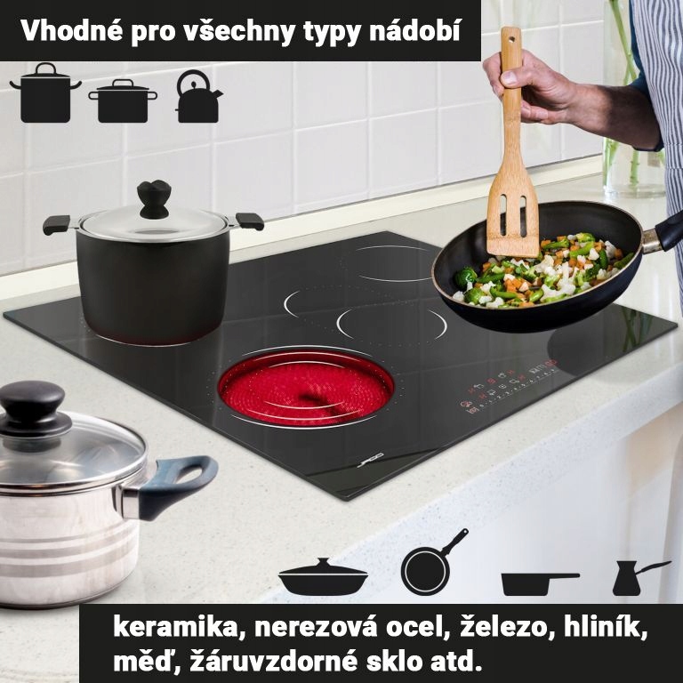 Vestavná sklokeramická varná deska s pěti plotýnkami. Je vhodná pro všechny typy nádobí (keramika, nerezová ocel, železo, hliník, měď, žáruvzdorné sklo atd.). Má technologii dotykového ovládání a devítistupňovou regulaci teploty. S kabelem (5-žilovým) bez zástrčky VDE. Má bezpečnostní funkce – dětský bezpečnostní zámek, indikátor zbytkového tepla, ochrana proti přehřátí, automatické vypnutí. Jednoduché a intuitivní ovládání, devět stupňů výkonu a časovač 0-99 minut dělají z této sklokeramické varné desky dokonalého spojence pro dlouholeté potěšení z vaření.