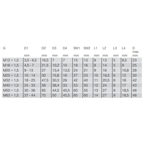 Standardní kabelová vývodka, tvar A dle DIN 46320 s jednoduchým těsnicím kroužkem z NR/SBR. S metrickým připojovacím závitem dle IEC 423. Stupeň krytí: s těsnicím kroužkem na připojovacím závitu IP 65, bez těsnicího kroužku IP 54.