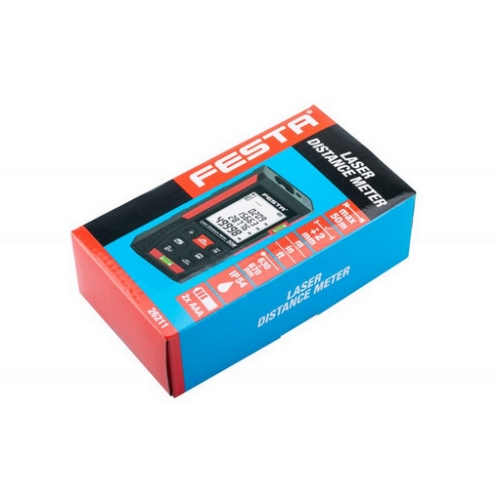 Laserový dálkoměr 50m FESTA 26211 rozsah měření 0,05 – 50 m přesnost měření ± 2 mm / 10m, ± 5 mm / 50m kontinuální měření, měření plochy, měření objemu, výpočet délky třetí strany dle Pythagorovy věty, sčítání/odčítání, max./ min. měření maximální úložiště na 100 hodnot, čtyřřádkový displej LCD FSTNS s podsvícením vlnová délka laseru 630 – 670 nm, pracovní teplota 0 – 40°C rozměry 112 x 50 x 25 mm, hmotnost 90 g dodáváno s: přepravní pouzdro, 2 x alkalické baterie AAA