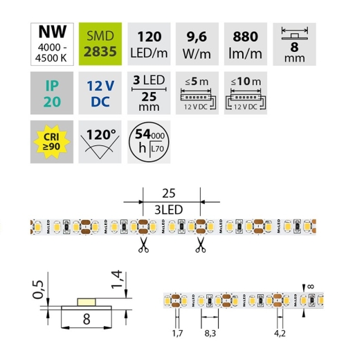 135 KčLED pásek McLED 12V neutrální bílá CRI90 š=8mm IP20 9,6W/m 120LED/m SMD2835 ML-121.839.60.2