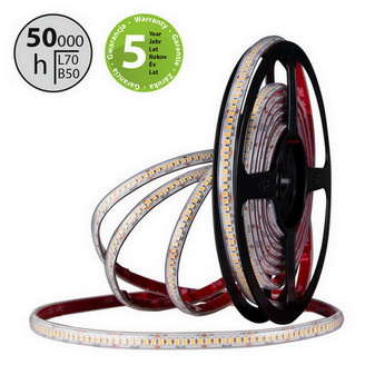 Stmívatelný LED pásek SMD2835, teplá bílá (3000K), 6W, 240LED, 500lm/m, CRI>90, segment 25mm, 6LED/segment, IP67, DC 24V, životnost 50000h, šíře 10mm, bílý PCB pásek, max. délka pásku při jednostranném zapojení: 13m, opatřen samolepící páskou 3M, UV stabilní. Balení 50m.