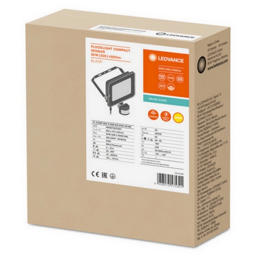 LED reflektor LEDVANCE FLOODLIGHT COMPACT 50. W s pohybovým čidlem a teplou bílou barvou světla (3000. K) poskytuje až 5000 lumenů. Je ideální pro venkovní použití díky své robustní konstrukci a flexibilnímu senzoru pohybu.