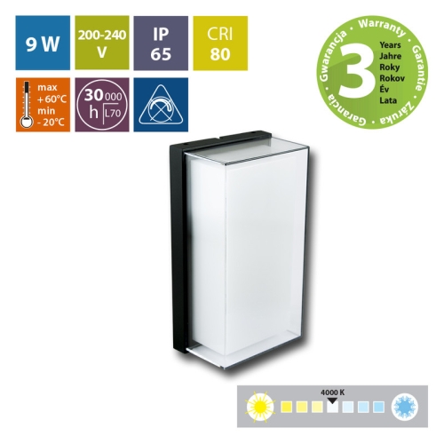LED nástěnné a fasádní svítidlo Ether, černá barva, 9W, 230V, IP65, neutrální bílá (4000K), světelný tok 720lm, vyzařovací úhel 135°, CRI 80, životnost až 30.000h, rozměry 120 x 80 x 220, materiál hliník/plast, nestmívatelné.