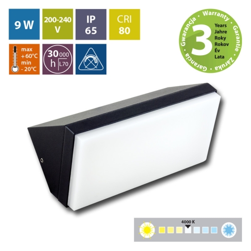LED nástěnné a fasádní svítidlo Penelope, černá barva, 9W, 230V, IP65, neutrální bílá (4000K), světelný tok 685lm, vyzařovací úhel 116°, CRI 80, životnost až 30.000h, rozměry 180 x 75 x 90, materiál hliník/plast, nestmívatelné.
