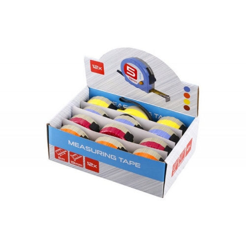 Metr svinovací v prodejním boxu – různobarevné provedení kalená páska, dobře čitelná stupnice, dvě brzdy, poutko, klip na opasek