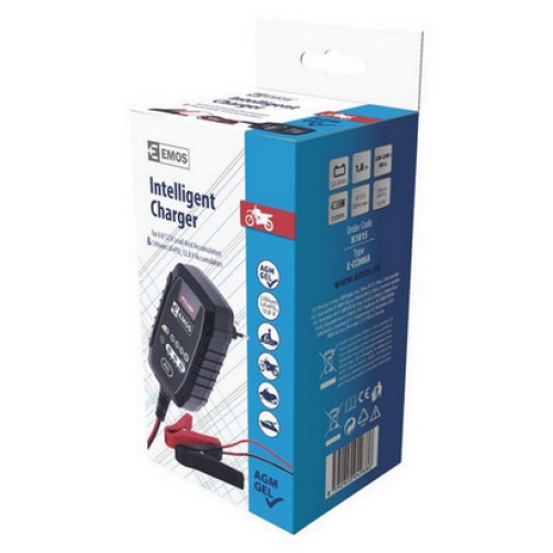 EMOS 6 V/12 V, 0,8 A inteligentní nabíječka je určená pro automobily, motocykly, záložní akumulátory. Nabíjí olověné aku 1,2–30 Ah WET (kyselinové), MF (bezúdržbové), záložní akumulátory VRLA, AGM, GEL i 12,8 V LiFePO4 akumulátory 2–15 Ah. Nabíječka slouží pro režim udržování akumulátorů všech velikostí. Nabíječka kromě nabíjení i udržuje akumulátor v trvale nabitém stavu. Nabíječka disponuje pamětí, při výpadku napájení si pamatuje režim nabíjení, pokračuje po obnovení napájení. Výhodou je možnost trvalého připojení k nabíjenému akumulátoru–udržovací režim.