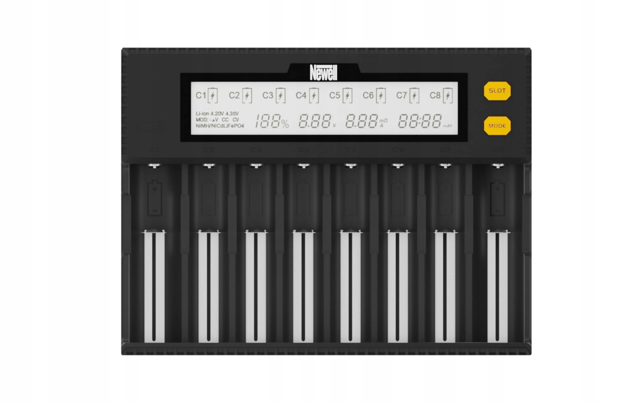 Newell C8 je univerzální osmi-kanálová nabíječka, kompatibilní s většinou válcových akumulátorů dostupných na trhu. LCD displej zobrazuje napětí, proud, dobu nabíjení, vnitřní odpor a stav nabití článku – díky tomu snadno zjistíte parametry a průběh nabíjení. Speciální konstrukce umožňuje současné nabíjení i těch největších akumulátorů (typu C nebo 22650) ve všech osmi kanálech současně.