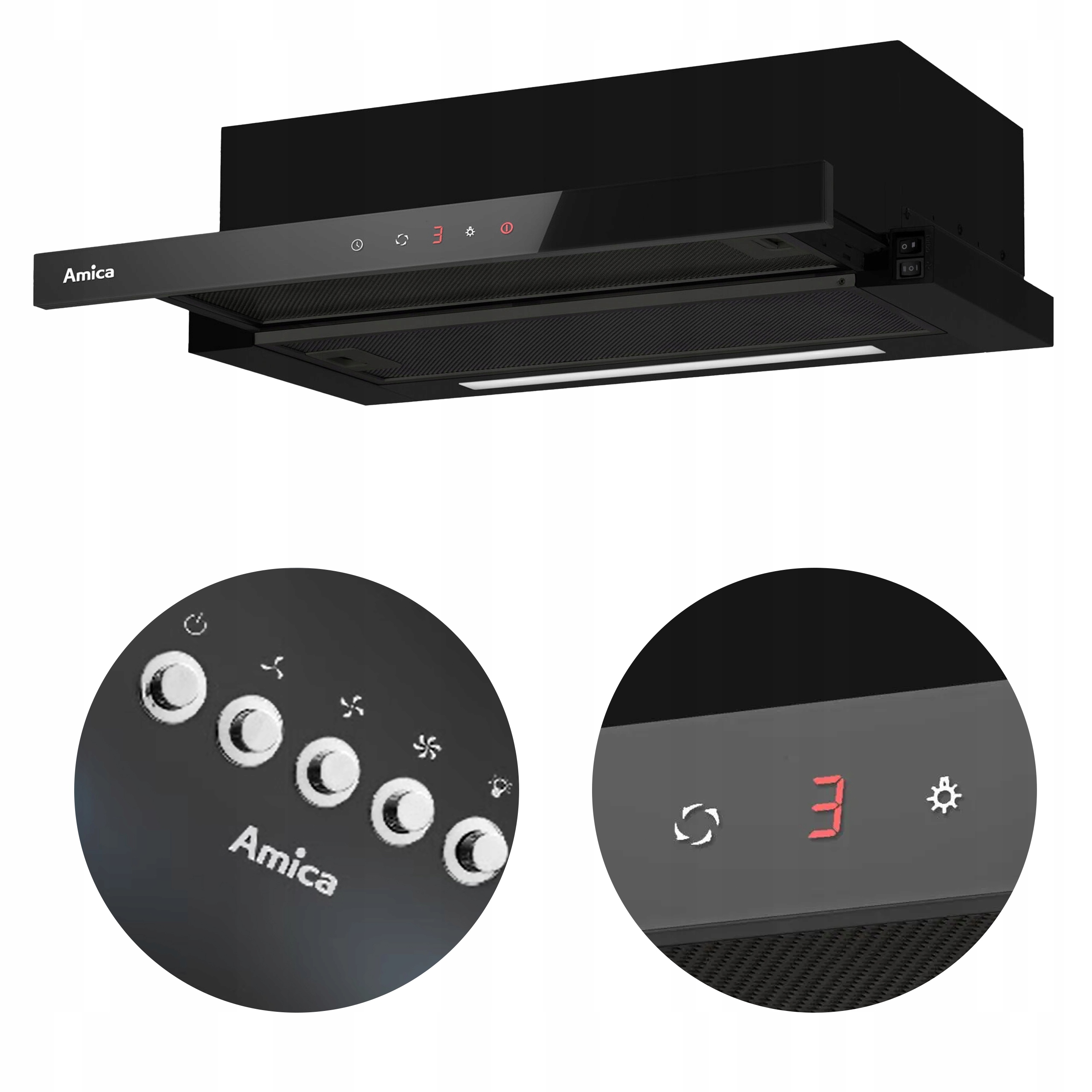 Amica OTP6651BG je vestavná digestoř, která se snadno vejde do kuchyňských skříněk hlubokých 30 cm. Je nejen velmi výkonná (maximální výkon v režimu odtahu: 508 m3/h), ale také zajišťuje příjemné a jasné osvětlení pracovní plochy (díky integrovaným LED páskům).