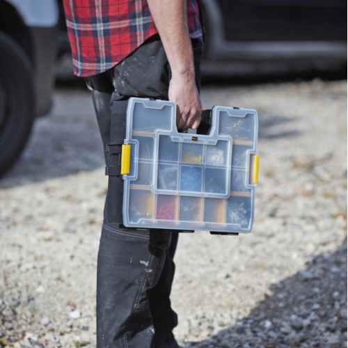Profesionální organizér Stanley SortMaster Variabilní systém přihrádek pro snadné uskladnění jak drobností tak i nářadí jako jsou šroubováky, kladiva, kleště, nože apod. Vyjímatelné rozdělovače dovolují nastavovat různé velikosti přihrádek. Speciální design víka zajišťuje pevné držení přihrádek – zabraňuje tak vysypání součástek uložených v přihrádkách organizéru. Pevné zámky k zabezpečení obsahu. Možnost stohování více organizérů. Celková hmotnost: 1,1 kg