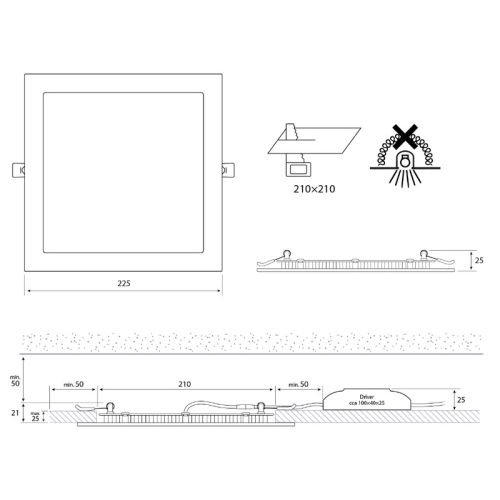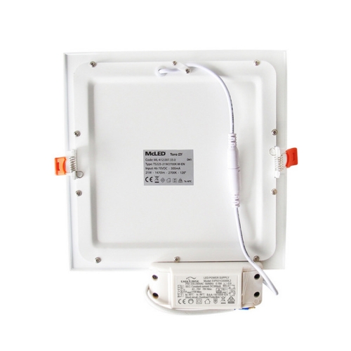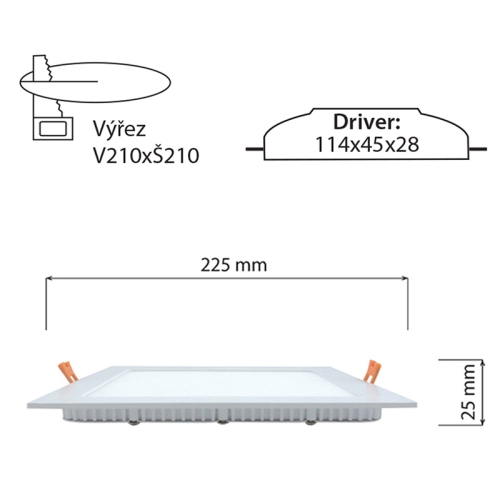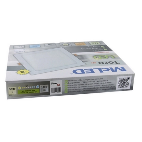 LED podhledové svítidlo 21W bílé, 230V, IP20, 3000K – teplá bílá, světelný tok 1520lm, vyzařovací úhel 120°, CRI 80, životnost 50.000h, rozměry 225x225x25mm, materiál hliník/plast, nestmívatelné, PF>0,9