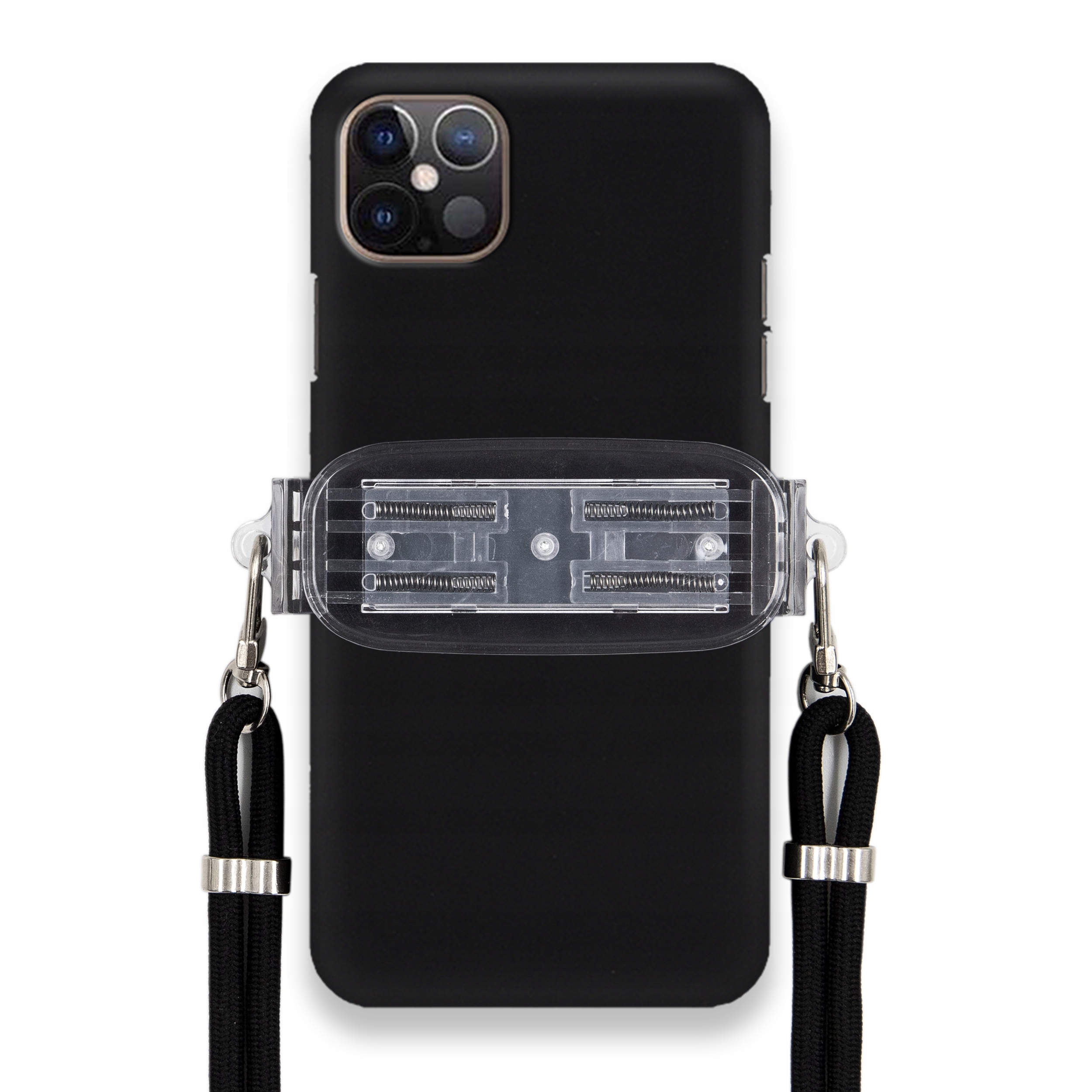 Sada pouzdro na telefon se skládá z elegantního černého matného pouzdro, průhledného obdélníkového držáku a černého provázku na krk. Je to ideální řešení pro lidi, kteří oceňují styl a funkčnost.
