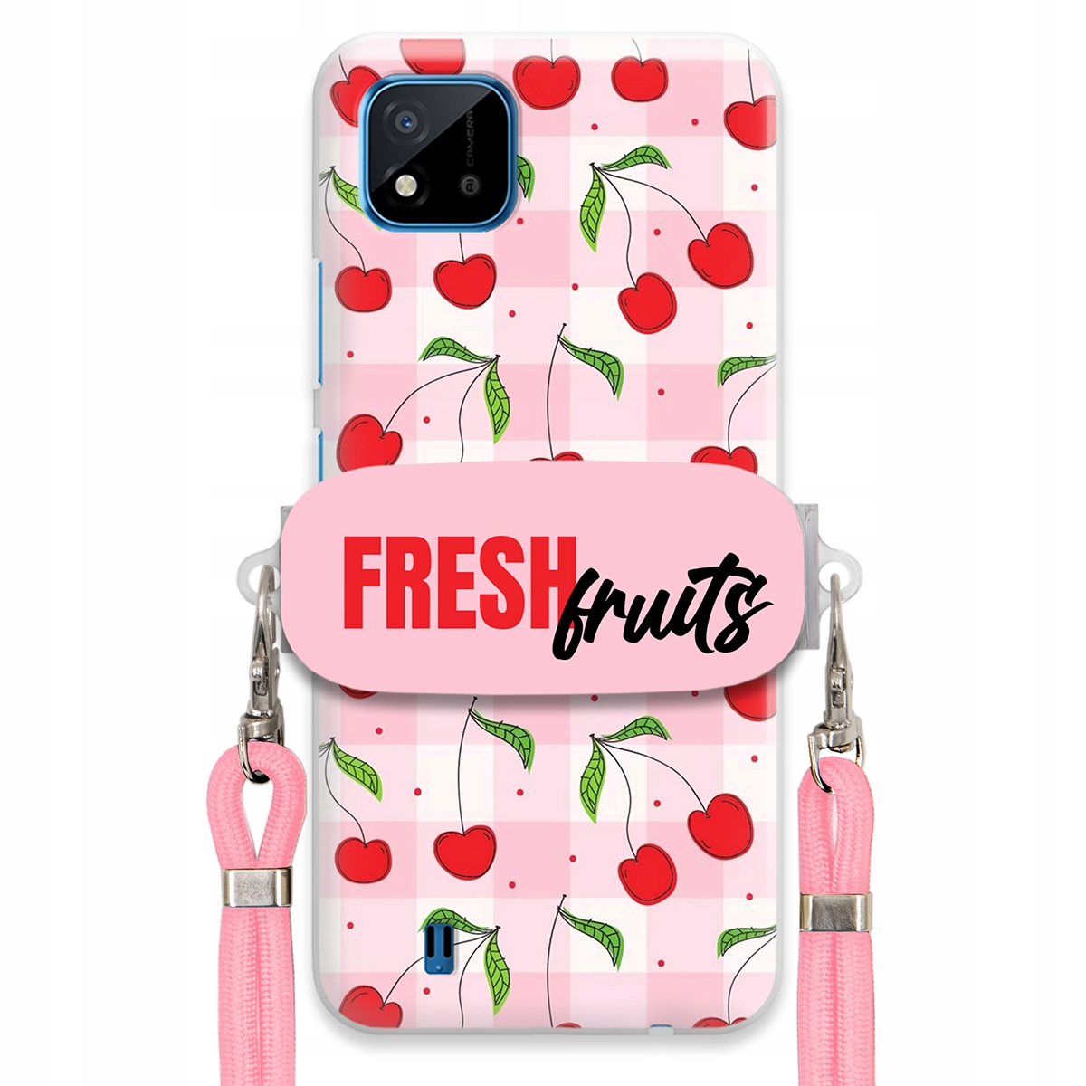Pouzdro pro REALME C20 Case + Držák Šňůrky Růžová FRESH FRUITS Mřížka Ovoce 🍒❤