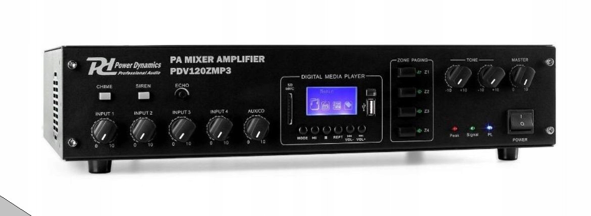 Power Dynamics PDV120ZMP3 je 4-kanálový 4-zónový PA (ozvučovací) zesilovač a ideální řešení pro různé aplikace, jako je paging (vyvolávání), oznamování, interkomové instalace, ozvučení pozadí a přenos zvuku v průmyslových instalacích apod.