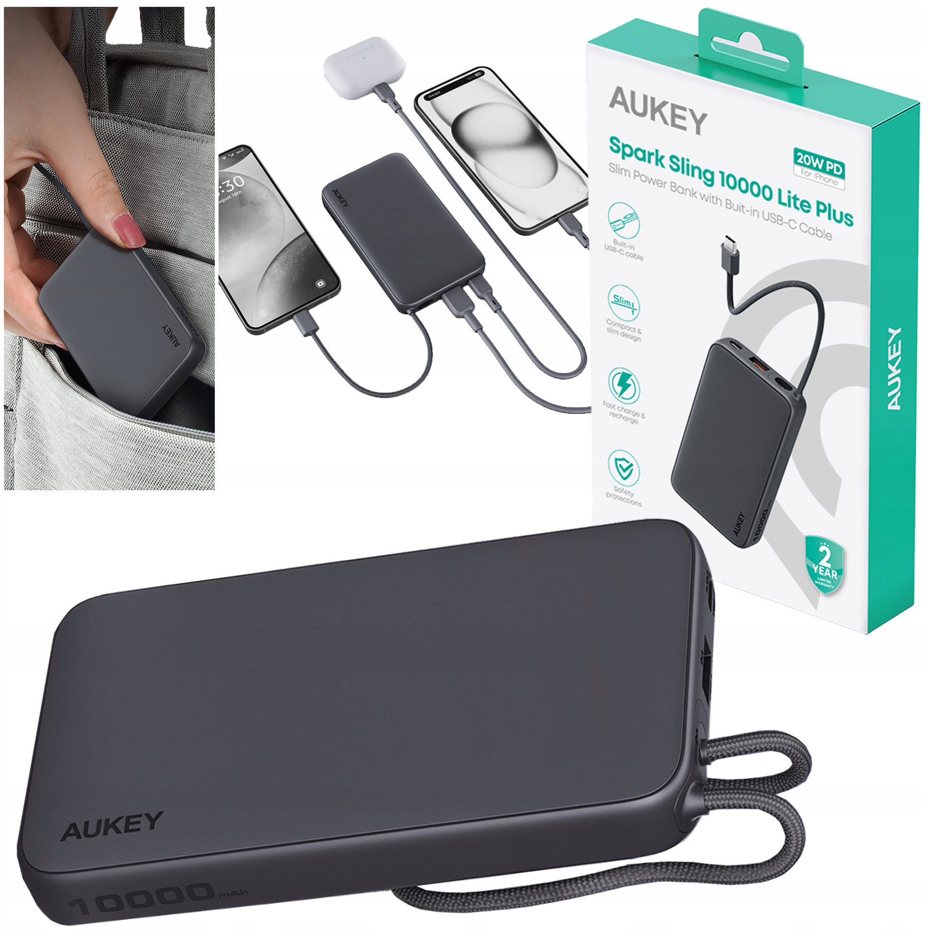 ✅ AUKEY PB-Y53 Spark Sling 10000 Lite Slim Power Bank s vestavěným USB-C kabelem