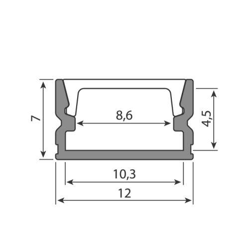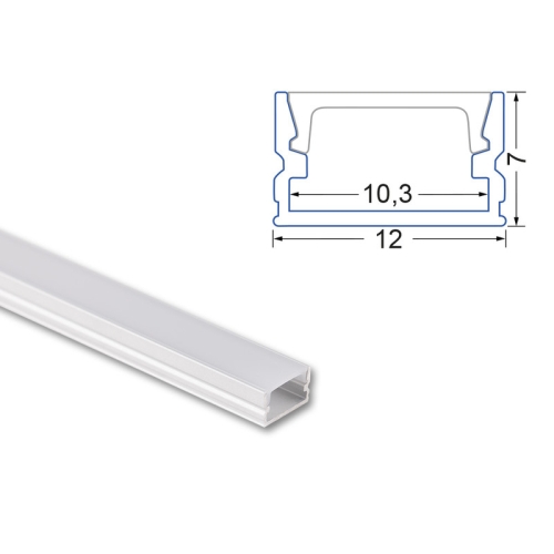 Přisazený hliníkový profil pro LED pásky, rozměry průřezu cca 12×7 mm. Součástí je mléčný difuzor, který lze do profilu nacvaknout. Tento profil je určen pro krytí a chlazení LED pásků do šíře 8 mm. Upevnění k podkladu lze provést pomocí montážních úchytů, vrutů, lepidel. K profilu lze zakoupit úchyty a koncovky.