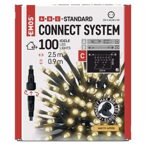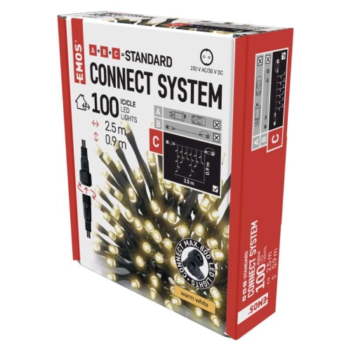 Propojovací vánoční řetěz EMOS Connecting D1. CW01 ZY1441 100. LED krápníky 2,5×0,9m teplá bílá. Bez vlastního napájecího zdroje, připojit do zásuvky.