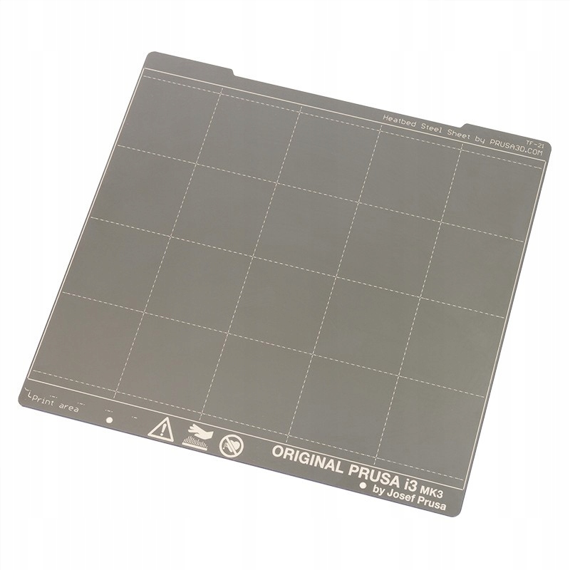 Vyměnitelná deska z pružinové oceli pracovního stolu. Obě strany hladké desky jsou pokryty samolepicí nálepkou z PEI plastu. Tento povrch zajišťuje vynikající přilnavost v kombinaci s většinou materiálů a tvarů. Přilnavost je tak dobrá, že některé materiály (např. TPU a PETG) mohou tak pevně přiléhat, že představují riziko poškození listu při odlepování výtisků – pro takové materiály se doporučuje saténová nebo texturovaná tkanina.