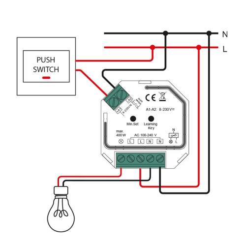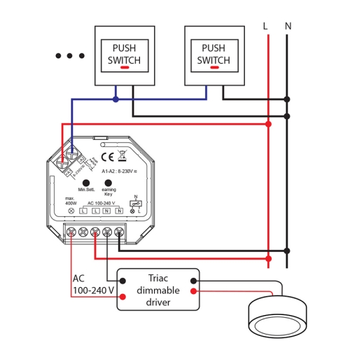 Přijímač k dálkovému RF ovladači pro stmívání svítidel napájených 230VAC (ovladač není součástí). Stmívá: klasické žárovky, halogenové žárovky, triakově stmívatelná svítidla (fázové stmívání na sestupné hraně – trailing edge dimming). Lze ovládat současně i libovolným tlačítkem. Přijímač si po výpadku napájení pamatuje poslední nastavenou hodnotu. Rozměry: 45,5x45x20,3mm – vhodné k montáži do elektroinstalační krabičky. Vstupní napětí: 100-240VAC. Max. zátěž: 400W/1,5A.