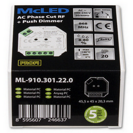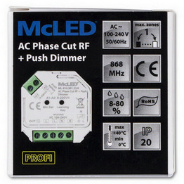 RF přijímač Mc. LED ML-910. 301. 22. 0 umožňuje bezdrátové stmívání svítidel napájených 230 VAC. Pamatuje si poslední nastavení a je vhodný pro montáž do elektroinstalační krabičky.
