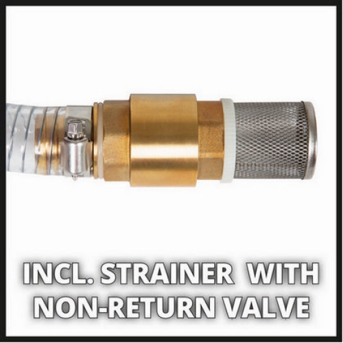 Tvarově stálá sací hadice pro vedení užitkové vody: Sací hadice Einhell je tvarově stálá nasávací hadice o průměru 25 mm (1 palec) a délce 4 metry. Díky přípojce o průměru 42 mm (1 ¼ palce) s vnitřním závitem a přiložené mosazné závitové spojce s vnějším závitem 33,3 mm (1 palce) je nasávací hadice Einhell vhodná pro zahradní čerpadla i domácí vodárny nebo automatické vodárny. Průhledná tkaninová hadice s ocelovým drátem je extrémně odolná, a proto je ideální pro použití s užitkovou vodou. Sada sací hadice zahrnuje mosaznou závitovou spojku s vnějším závitem 33,3 mm (1 palec). Mimoto sada obsahuje mosazný sací koš s integrovaným zpětným ventilem s jemnými oky z ušlechtilé oceli a pro bezpečné upevnění dvě hadicové spony z oceli.