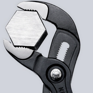 KNIPEX Cobra Nastavení stisknutím tlačítka přímo na obrobku. Jemné nastavení pro optimální přizpůsobení různým velikostem obrobků a ergonomickou polohu rukojetí. Samoupínání na trubky a matice: žádné sklouznutí na obrobku, práce bez námahy. Plochy čelistí se speciálně kalenými zuby, tvrdost zubů asi 61 HRC: trvale spolehlivé uchopení díky vysoké odolnosti proti opotřebení. Posuvný průchozí čep kloubu: vysoká stabilita díky dvojitému vedení. Spolehlivé zaskočení čepu kloubu: žádné neúmyslné přenastavení. Kryt chrání prsty před skřípnutím. – Nastavitelných pozic: 13 – Kapacita pro trubky (průměr): Ø 1 in – Kapacita pro matice rozměr klíče v: 27mm – Kapacita pro trubky (průměr): Ø 30mm