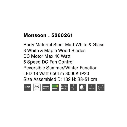 Stropní ventilátor NOVA LUCE MONSOON s integrovaným LED osvětlením 18. W a teplou bílou barvou světla 3000. K zajišťuje efektivní cirkulaci vzduchu a úsporu energie. Ideální pro moderní interiéry.