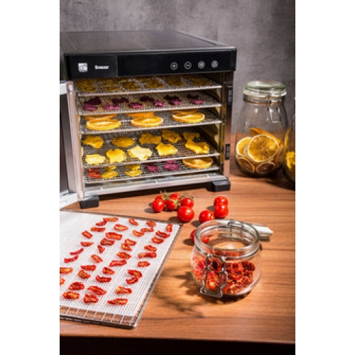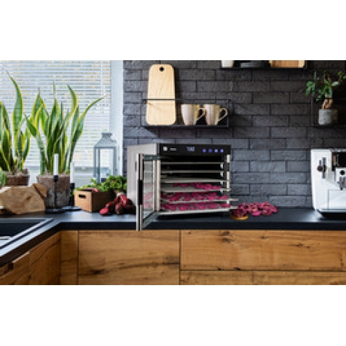 Horizontální nerezová sušička potravin s dvířky, časovačem, 6 sušícími platy a 6 jemnými síty suší ovoce, zeleninu i další suroviny naprosto rovnoměrně. Čím vás ještě nadchne?