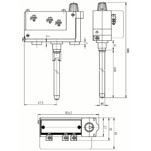 Stonkový termostat APATOR Metra TH 160.2 20-80°C slouží pro spínání elektrických obvodů. Nefuguje jako hlavní spínač. Specifikace stonkového termostatu APATOR Metra Stonkový termostat APATOR Metra TH 160.2 s rozsahem 20–80 °C se skládá z teplotního čidla a spínací hlavice. Dilatační změny čidla ovládají spínač pomocí páky. Připojení vodičů je možné přes šroubové svorky (max. 4 mm²). Ochranný vodič musí být zapojen na ochrannou svorku. Termostat je vybaven krytem svorek pro zvýšení bezpečnosti. Při montáži je nutné chránit stonek a hlavici před nárazy a zabránit deformaci stonku. Kromě drátových termostatů si u nás můžete pořídit i termostaty drátové, s dotykovou obrazovkou či s otočným knoflíkem. Nabízíme i další regulační a topnou techniku, jako například přímotopy, infrapanely, akumlační kamna a další. Rozměry termostatu jsou: délka t (+/- 3mm): 388 mm; délka stonku (+/- 3mm) 315mm. Technické detaily termostatu APATOR Metra Termostat stonkový APATOR Metra TH 160.2 20-80°C vyniká přesností nastavení ±10 % z nejvyšší hodnoty jmenovité vypínací teploty nastavené na termostatu. Průměr stonku 8 mm. Max. teplota spínací hlavice 120 °C. Životnost 10 000 cyklů. Jmenovité napětí 250V AC. Jmenovitý proud 15 A. Regulační rozsah 20-80 °C. Diference spín. teploty 2-8 K. Počet svorek 3. Provedení přepínací. Vždy se řiďte postupem od výrobce. Zásahy do elektroinstalace provádějte jen tehdy, jste-li k takovému úkonu oprávněni. V opačném případě přenechte instalaci na odborníkovi s příslušným certifikátem. Certifikáty výrobku Termostat stonkový APATOR Metra TH 160.2 20-80°C splňuje příslušné normy ČSN. O společnosti APATOR METRA APATOR METRA nabízí široký sortiment měřicí techniky včetně indikátorů topných nákladů, vodoměrů, rádiových modulů, kalorimetrů, odečtových jednotek, termostatů, teploměrů, manometrů, doplňkových služeb a aplikací pro dálkový odečet, včetně možnosti zakázkové výroby.