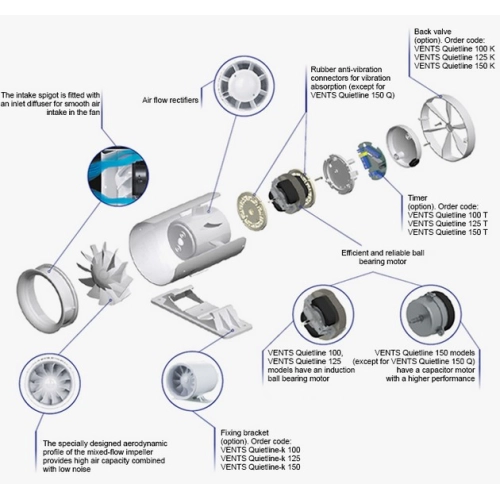 Ventilátor VENTS 100 QUIETLINE-k – do potrubí, tichý, úsporný, včetně držáku na povrch, kuličk. ložiska, montáž do potrubí, 25dB, 7,5W, IPX4, bílý, 100m3/h.Domovní axiální ventilátor Vents QUIETLINE je určen k odsávání vzduchu z menších bytových prostor jako jsou koupelny, toalety, kuchyně a to díky své tichosti a úspornosti. Ventilátor se montuje přímo do potrubí. Vzhledem ke svým technickým parametrům se doporučuje ventilátory používat v kombinaci s kratším vzduchotechnickým potrubím. Ventilátory typové řady QUIETLINE jsou již v základu vybaveny kuličkovými ložisky, což umožňuje montáž v jakékoliv poloze nebo jejich využití k nepřetržitém dlouhodobém provozu. Všechny motory jsou vybaveny tepelnou pojistkou. Kryt a vrtule ventilátorů je vyrobena z vysoce kvalitního ABS plastu odolnému vůči UV záření. Tvar vrtule zajišťuje efektivnost a trvanlivost ventilátorů. Ventilátory mohou ovládat pomocí samostatného přepínače nebo mohou být zapojeny paralelně s osvětlením. Modely označené „T“ jsou vybaveny časovým spínačem s nastavitelným doběhem v rozsahu od 2 do 30 minut. Ventilátory se montují do kulatého potrubí. Typy s označením „k“ jsou vybaveny držákem na povrch.