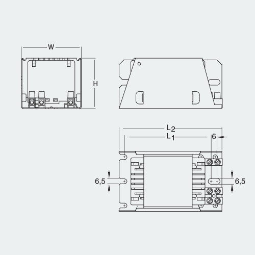 Předřadník pro halogenidové výbojky s integrovanou tepelnou ochranou. IP20 předřadník pro vestavěné použití napuštěné polyesterovou pryskyřicí šroubové svorky 4 mm2 s tepelnou ochranu pro max. proud do 0,98 A