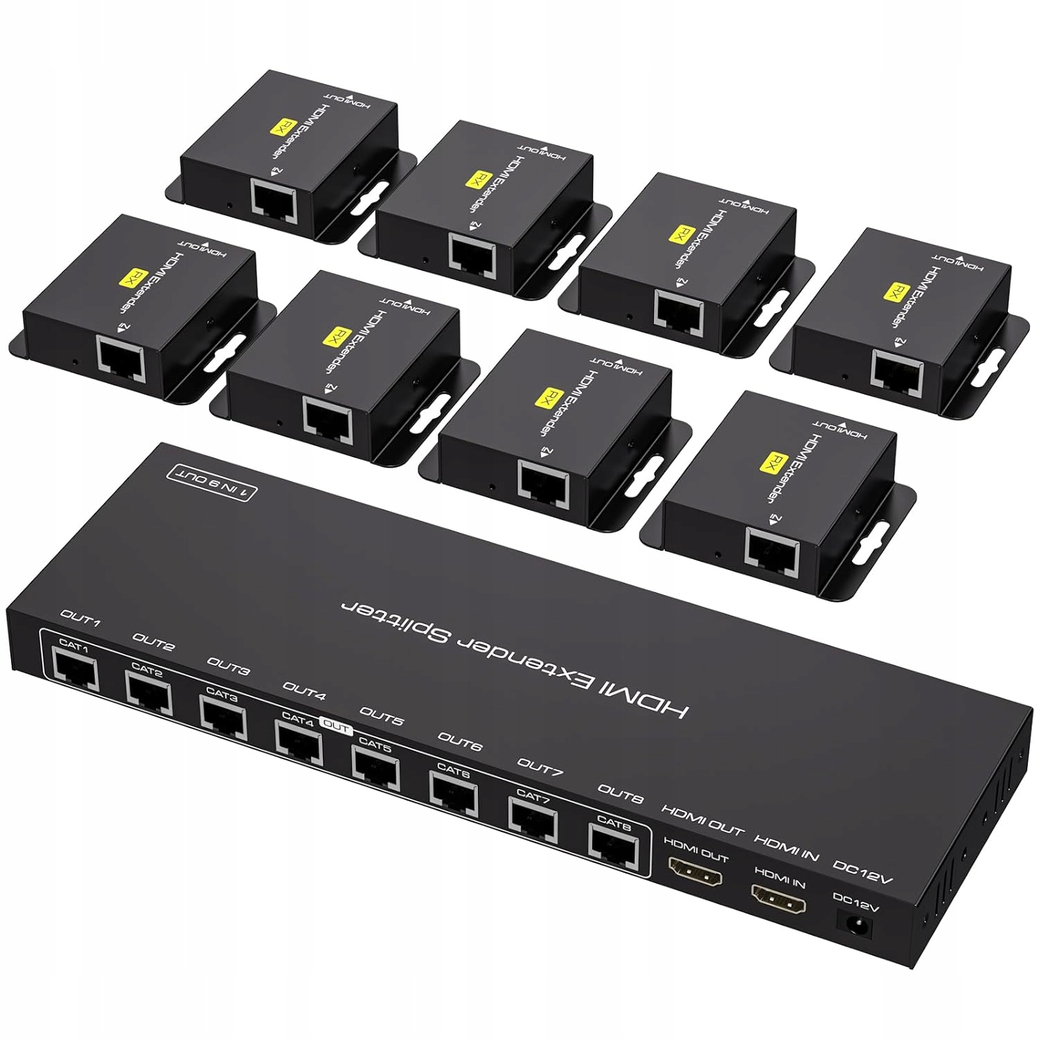 - HDMI rozbočovač – HDMI prodlužovací kabel může současně přenášet audio a video data s vysokým rozlišením až 8 HDMI monitorů pomocí bezkyslíkatého síťového kabelu Cat6/7 a do HDMI monitoru pomocí konektoru Ring-Out. Při rozlišení 1080p60 Hz podporuje 8 síťových portů přenosovou vzdálenost až 50 m a 1 výstupní port HDMI podporuje až 10 m standardního kabelu HDMI.