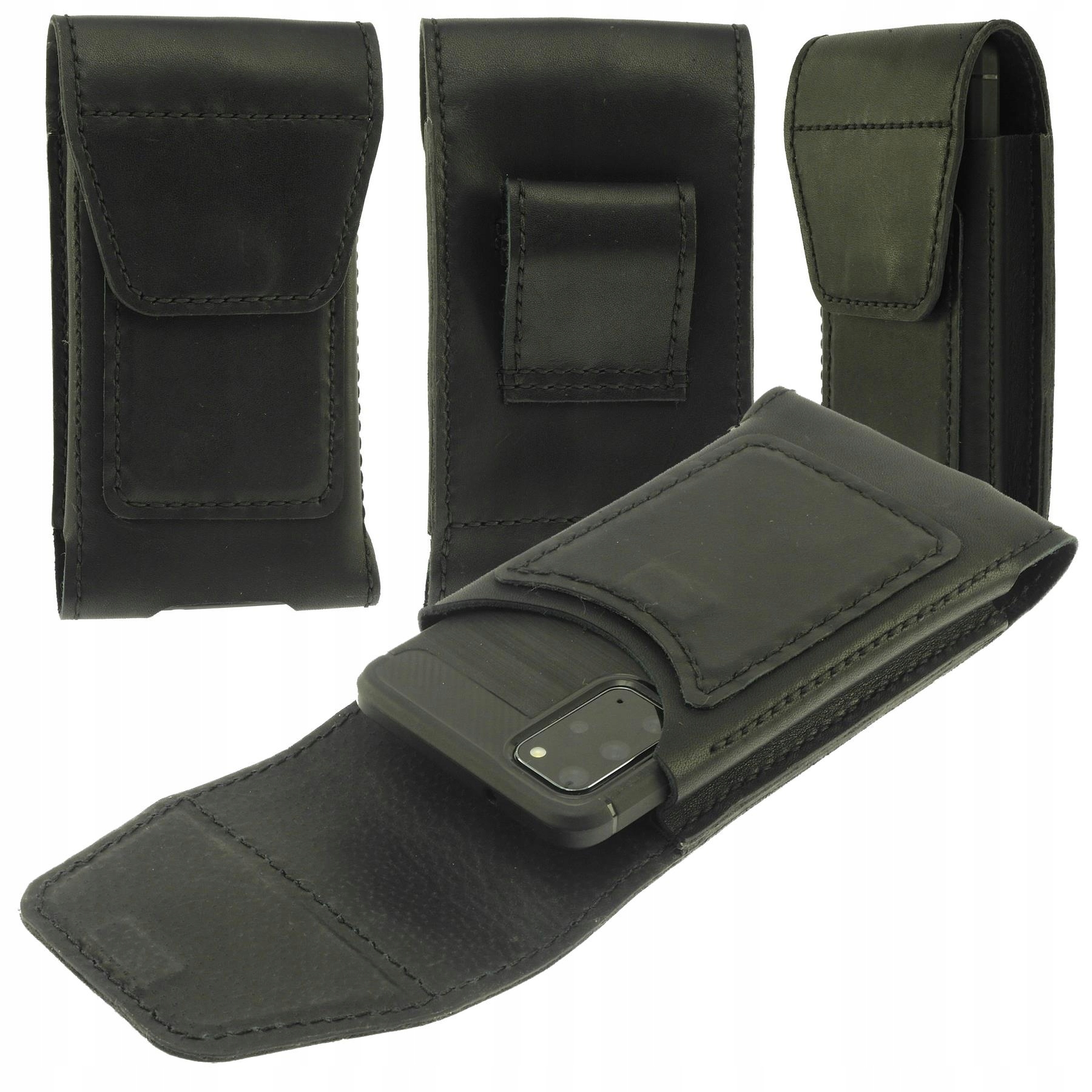 Ručně šité vertikální pouzdro pro telefon s upevněním na opasek, lze jej použít také s telefonem, který má nasazený přídavný chránič