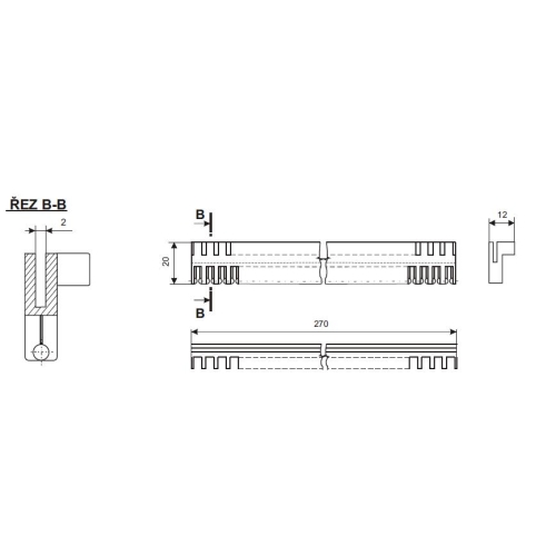 Plastová lišta pro fixaci vodičů v rozvaděčích pro přehledné a bezpečné vedení vodičů v zadním zapojení umožní fixaci vodičů v poloze s čitelným popisem barva bílá Užiti: v rozvaděčích pro fixaci izolovaných propojovacích vodičů o průřezech 0,5 až 10 mm2 Popis: výlisek z pružného plastu o rozměrech 270 x 20 x 12 mm provedení s odolností proti šíření plamene (samozhášivost) podle UL 94 – V0 Montáž: hřeben se nasazuje na hranu příčky, nebo rámu rozvaděče z materiálu o tloušťce 1 až 2 mm vodiče se zafixují mezi zuby hřebenu