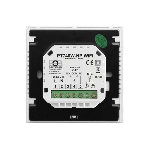 Wi. Fi termostat ELEKTROBOCK PT740. W-NP bílý nabízí pohodlné ovládání teploty pomocí aplikace a spolehlivý beznapěťový výstup pro spínání zdroje tepla.