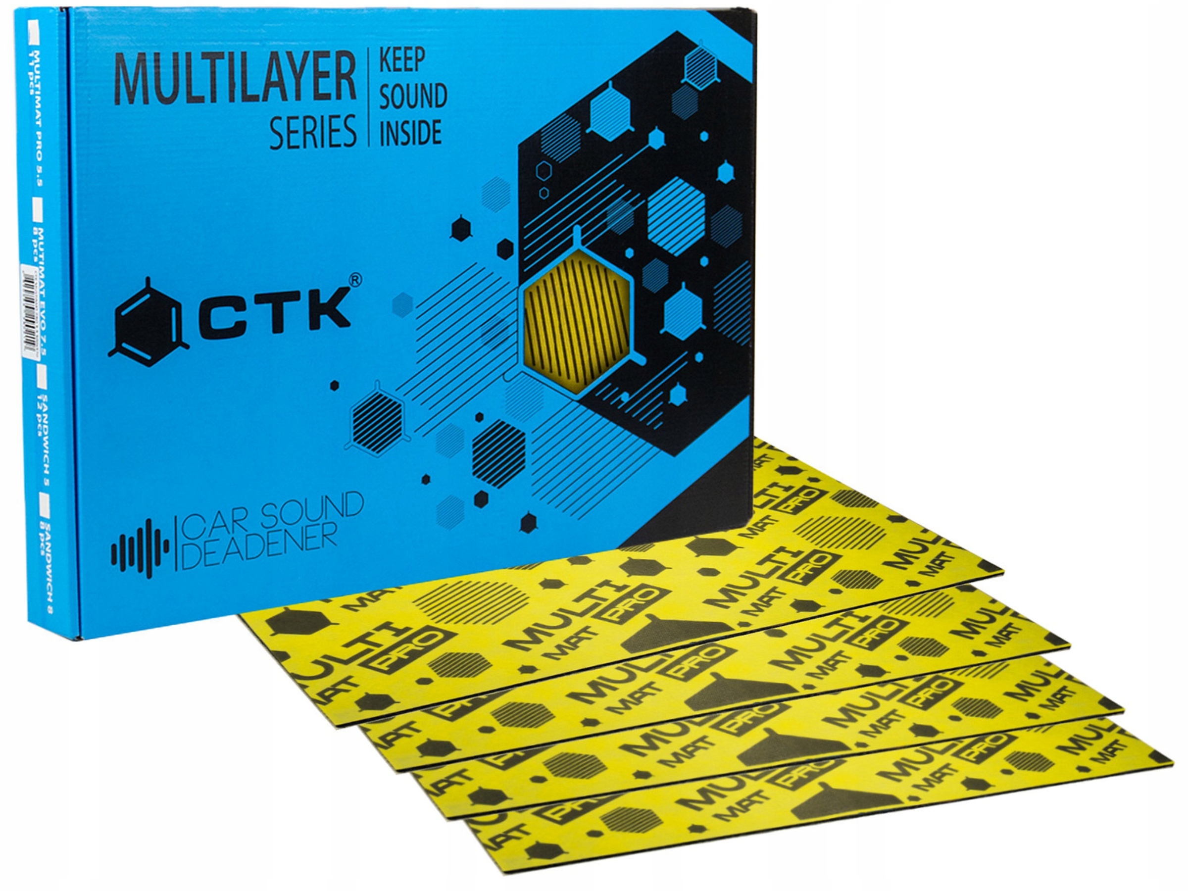 - vrstva 1 – vysoce účinné antivibrační materiály tlumící vibrace a rezonance prvků karoserie a navíc izolující interiér od vnějšího hluku, kterými jsou vysoce kvalitní rohože na bázi butylu, hliníku a polymerů s co nejvyšší hodnotou koeficientu MLF (např. tlumící rohože CTK Dominator, CTK Premium, CTK Standard Professional),